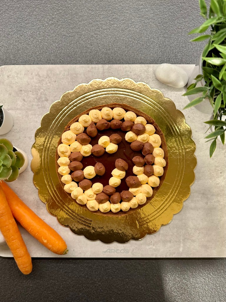 Voi potete dire “ti è finita la crema dentro la sac à poche?”. No, semplicemente volevo fare qualcosa di incompleto e poi perché, insomma, ero stanco un po’. Devo dire, però, che questo risultato mi piace assai. La ganache al cioccolato fondente che vedete non è altro che quella che abbiamo fatto avanzare e, una volta tenuta in frigo per una 15ina/20 minuti, l’ho montata con lo sbattitore elettrico e ha cambiato magicamente colore diventando anche più solida e maneggevole dentro la sac à poche. Ma voi potete decorare davvero come più vi piace (se vi state chiedendo invece cosa è quell’altra crema che fa il girotondo della crostata, beh è panna da montare, un cucchiaio di mascarpone e zucchero e un briciolo di colorante arancione, niente di che insomma). Vi dirò che inizialmente ci avrei volute mettere un po’ di chips di carote dolci e magari anche scorza di arancio per dargli quel colore autunnale ancora di più. Fatemi sapere che ne pensate e se avete voglia di replicarla a casa 😋