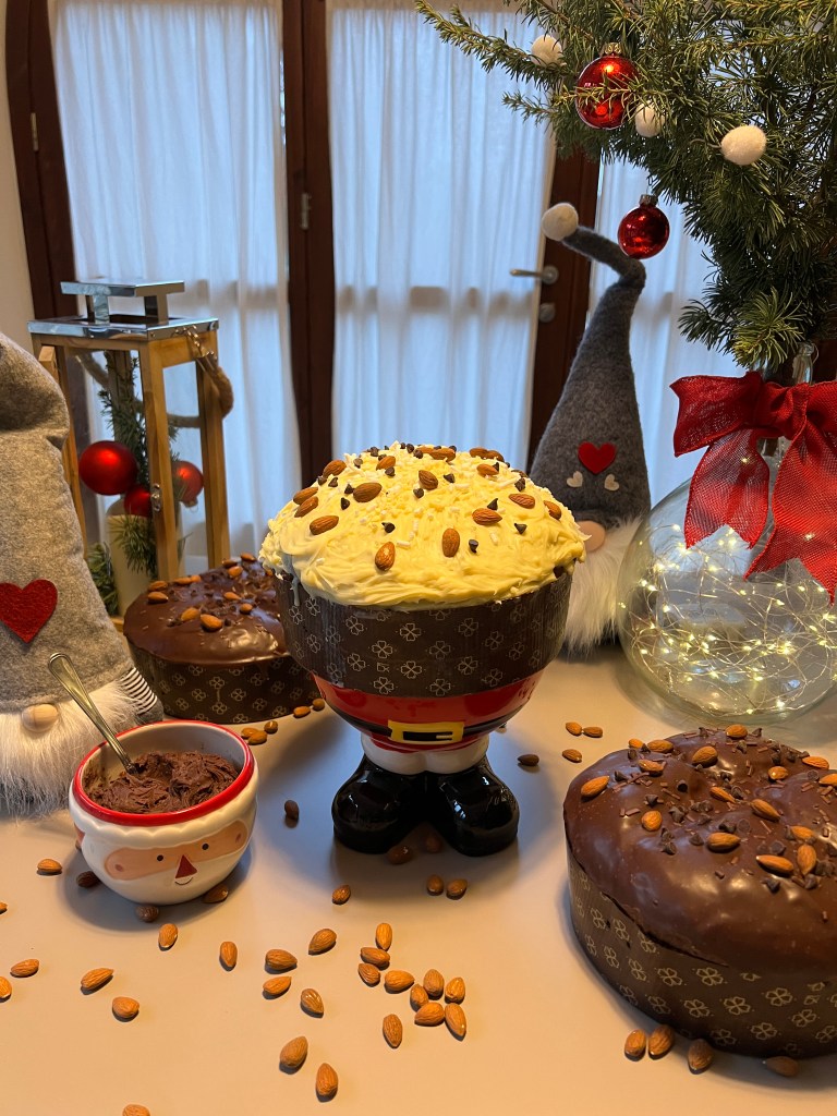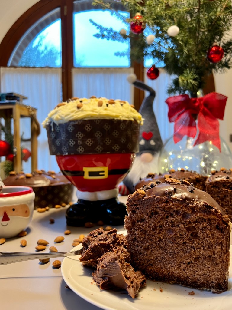 Per la decorazione facciamo qualcosa di industriale ahahahah e ci schiaffiamo gocce di cioccolato, granella di zucchero e mandorle. Potete montare la ganache al cioccolato avanzata col mixer per 1 minuto e usarla come crema spalmabile da accompagnare al panettone (come ho fatto nella foto con la fetta ecco).