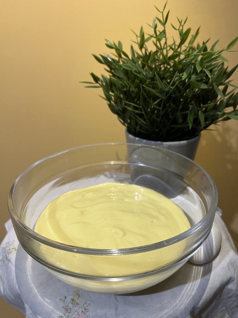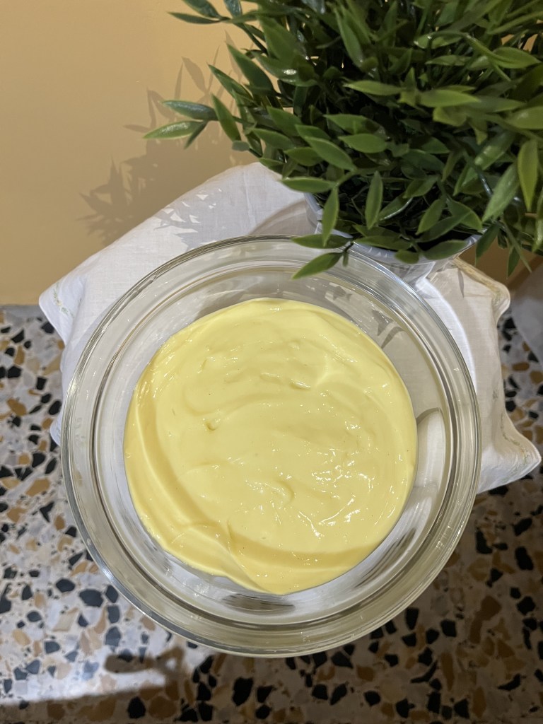 Strizzate la gelatina per bene, versatela nella crema e mescolate tutto per bene con tutta la potenza che avete. Mettiamo la crema adesso in una bowl e poi copriamo con la pellicola a contatto. La crema è pronta, cioè no, va messa da qualche parte a fa raffreddare. Più tempo raffredda e meglio è. Ricordate comunque che una volta che userete la crema, la dovete mescolare energicamente sempre con una frusta o con un cucchiaio. Adesso è davvero pronta ve lo giuro eheheh.