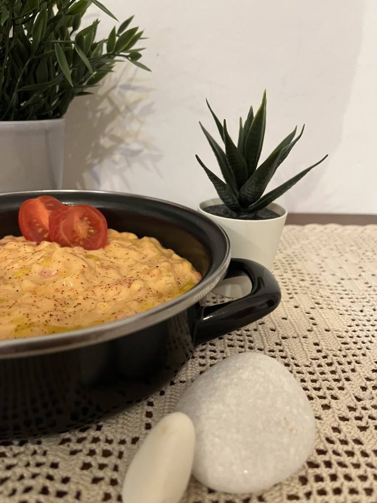 Sono solito ad aggiungere proprio a fine, tutte le spezie che in queste caso erano il sale, la noce moscata, il pepe e anche un po’ di peperoncino macinato in polvere. Noterete che comunque la besciamella sarà pronta non appena inizierà tipo a sobbollire e quindi a scoppiare bolle di crema e sporcherà tutta la cucina ecco. Per non farla seccare, coprite con pellicola a contatto e iniziate a tagliare i pomodorini e la cipolla che poi uniremo qui dentro.