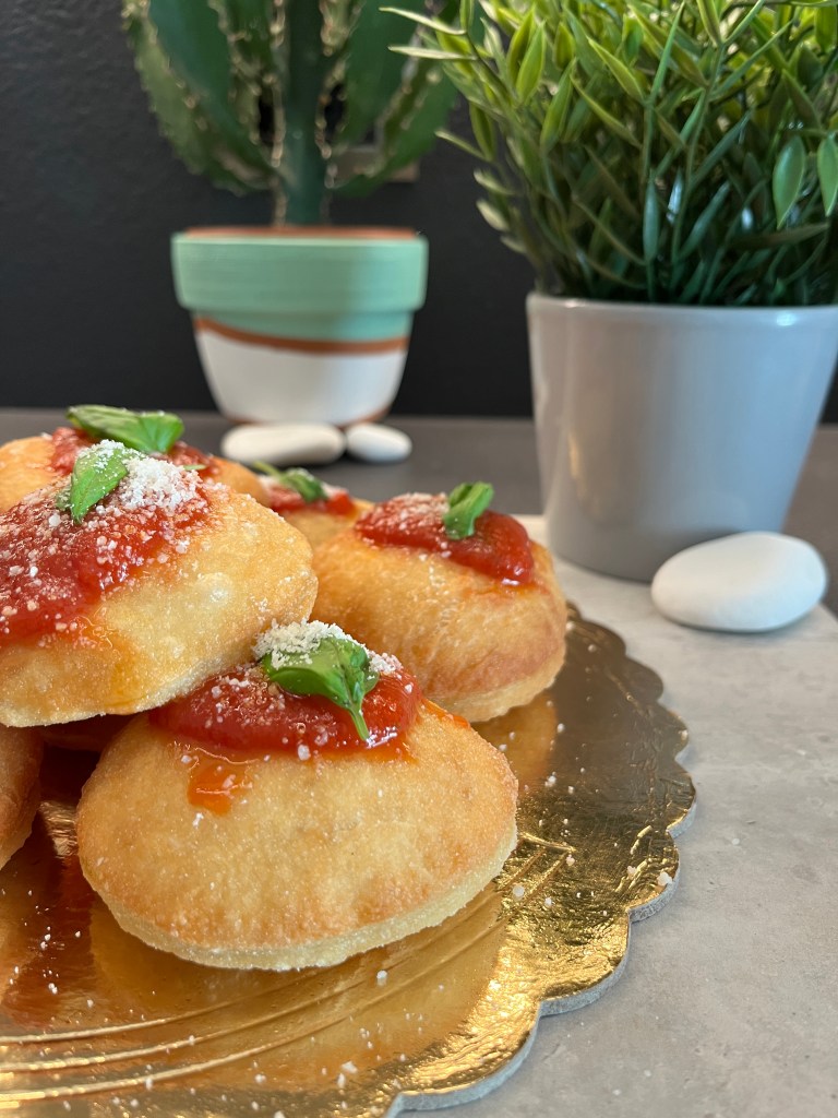 Facciamo scaldare l’olio e non appena arriva a 175 gradi o giù di lì, possiamo immerger le nostre pizzette e le facciamo cuocere fino a doratura e boom! So pronte, cioè no, vanno decorate con la salsa di pomodoro e compagnia bella.