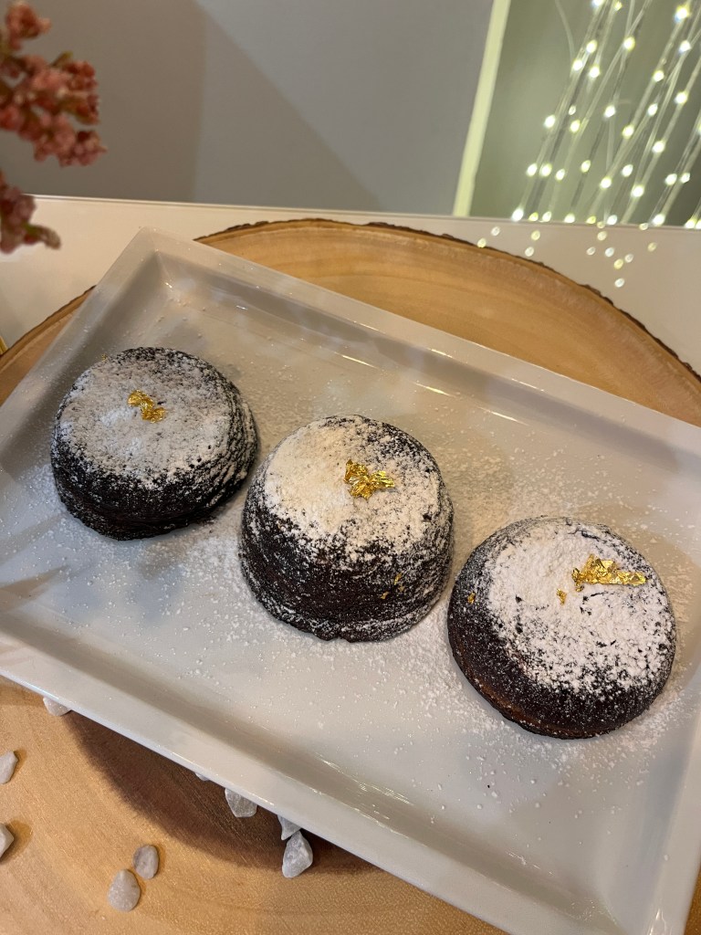 Accendiamo il forno a 180 gradi, modalità statica. Nel frattempo prendiamo i nostri stampini, li imburriamo e li cospargiamo con un po’ di cacao amaro e farina 00 (io ho fatto totalmente cacao amaro e sembra che si sia creata una sorta di pellicolina protettiva, come se proteggesse il vero colore del tortino, bellino da vedere, ma la gente potrebbe credere che sia bruciato, cosa che non è minimamente). Copriamo i pirottini fino a quasi l’orlo (lasciamo all’incirca mezzo centimetro dalla fine del pirottino), appoggiamoli sulla teglia e, appena il forno raggiunge la temperatura giusta, mettiamo in forno e facciamo cuocere circa 14/15 minuti (dipende ovviamente dal forno). Una volta levati dal forno, li facciamo un po’ raffreddare e sformiamo dallo stampo quando sono ancora tiepidi. Spolverata di zucchero a velo e tadan, pronti per voi. Se poi volete fare una figura ancora più bella: aggiungete un po’ di foglie oro.