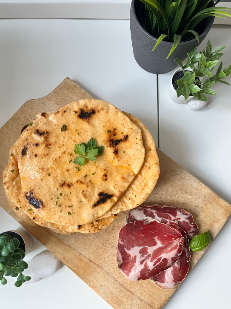 La parte ganza: passato il tempo di lievitazione, finalmente l’ultimo, cosa facciamo? Prendiamo il matterello, infariniamo il piano di lavoro e giù a stende sottile sottile le nostre palline di impasto (2/3mm è perfetto) ricordatevi che non devono essere enormi perché vi devono entrare nella padella antiaderente che avreste dovuto mettere a riscaldare già sul fuoco (però sì, è colpa mia che non ve l’ho detto subito maremmina). Non appena la padella è bella calda, cuociamo uno alla volta il nostro pane naan al pomodoro. Giratelo di tanto in tanto e se fa delle grosse bolle, voi giù di cattiveria, le schiacciate piano piano che sennò non si cuoce in modo omogeneo. Attenti a non farli bruciare e continuate così fino a finire tutte e 12 le palline. Una volta pronte, le spennelliamo con il nostro olio o burro aromatizzato.
