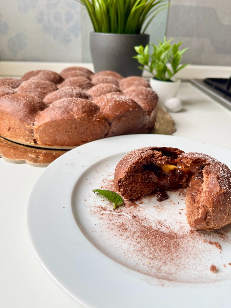 Raggiunta la cima, spennellate con del latte o burro o uovo (quello che avete ecco, io ho fatto col latte), levate dal forno e accendetelo a 180 gradi, modalità statica. Raggiunta la temperatura, infornate nella parte centrale per 30/35 minuti fino a doratura. Una volta pronto, pensate alla vostra mamma e tadan, potete servirlo rovente così il cioccolato vi ustionerà la lingua, oppure lo fate intiepidire e ognuno si stacca una sua pallina.