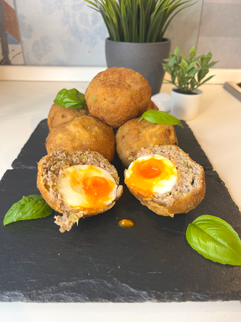Se l’olio è a temperatura, immergiamo la prima scotch egg e vediamo come si comporta con l’olio, se non vi schizza e siete ancora vivi e vegeti, vol dì che siete stati bravi. Fate cuocere la prima da sola e appena è bella dorata, la scolate e mettete le altre scotch eggs a cuocere (anche più di una) e friggetele tutte fino, appunto, a doratura. Sono stratosferiche mangiate anche appena cotte e il tuorlo dentro sarà di un wow assurdo. Guardate il video mi raccomando ecco 🥰