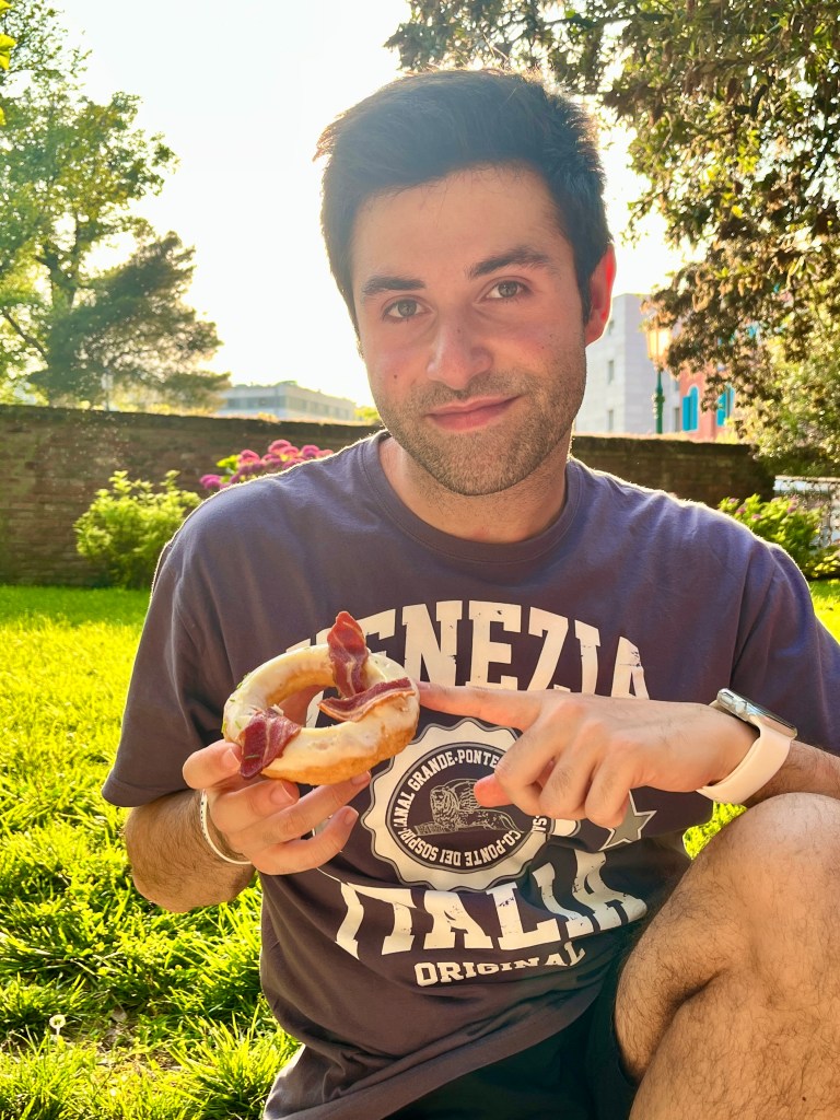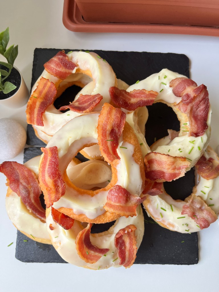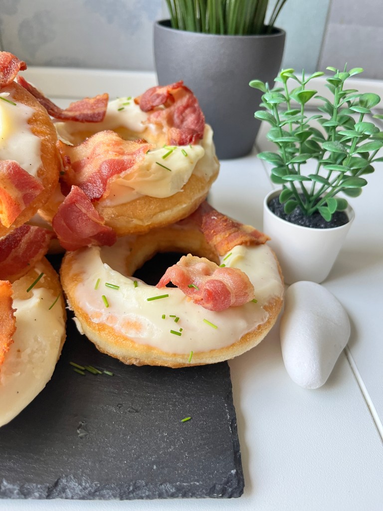 Ora raga c’è la parte che vedete voi cosa fare: c’è da cuocere il bacon. Avete due possibilità: o sporcare un’altra padella pulita dove lo fate soffriggere a fiamma media oppure potete immergerlo nell’olio già caldo dove avete fritto le ciambelle. Io ho scelto quest’ultima e sono venute buonissime. Quindi ecco, cuocete o fate soffriggere il bacon fino a che non diventa magnificamente croccante ed una volta pronto tagliatelo o spezzettalo in pezzi grossolani. Predente le ciambelle adesso e tingetele nella besciamella fino a metà in modo da decorare solo la parte sopra. Posatele da qualche parte e con la besciamella ancora calda, appoggiateci sopra i pezzi di bacon. Infine, spolverate con dell’erba cipollina o con qualcos’altro che più vi aggrada, magari del rosmarino o del prezzemolo, o boh, origano ecco. Io comunque non ho sentito la necessità di aggiungerci del sale ulteriormente a fine cottura in quanto il bacon era molto speziato di per sé, fatemi sapere raga se replicherete anche voi queste ciambelle belline belline 🤭