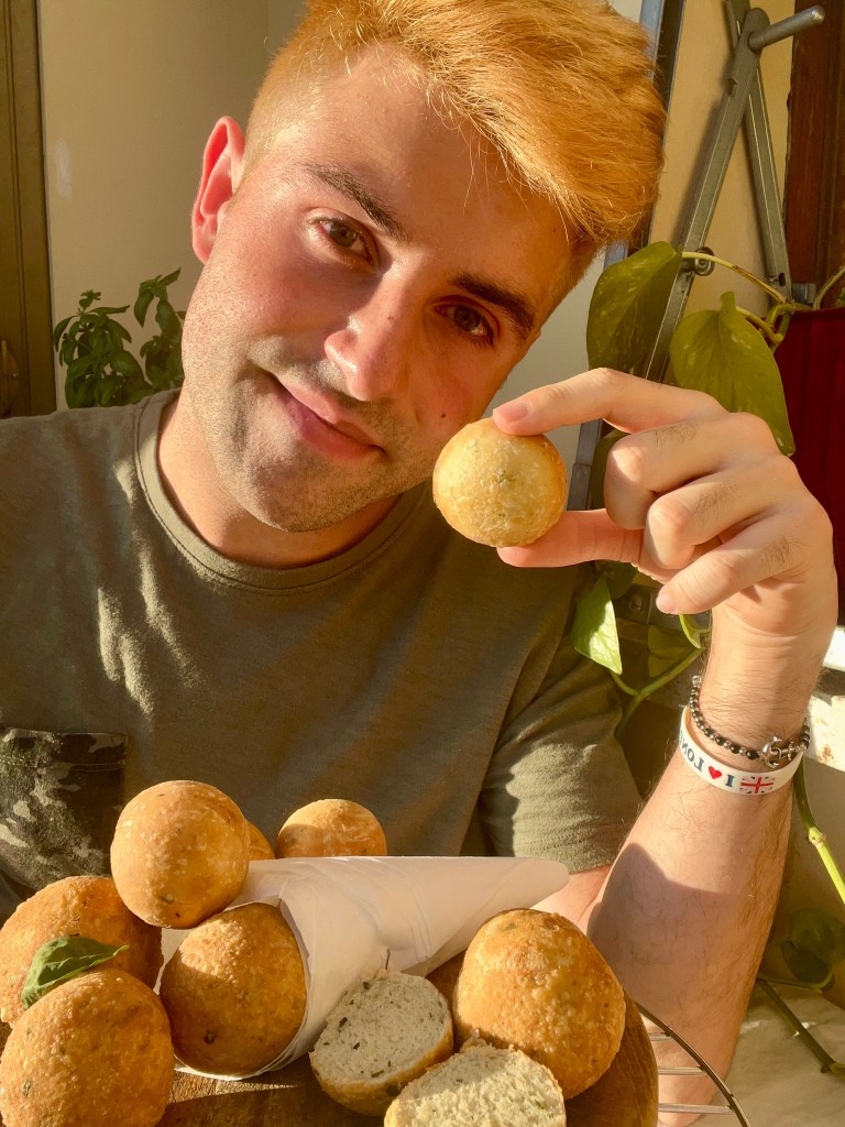 Vi dirò, in verità volevo fare le zeppoline napoletane fritte alle alghe, ma poi non so cosa mi sia preso e ho voluto fare di testa mia perché forse mi sono fatto BIONDO, esatto e guardatevi sotto la foto di come sono letteralmente venuto bene 😍 so proprio contento sii. Ma tornando alle mie palline fritte, ho fatto proprio come mi pare: un semplice impasto per la pizza, solo che ci ho messo dentro tutto e di più anche se il vero protagonista possiamo dire che è il basilico in quanto ne abbiamo coltivato tantissimo a casa e quindi quello non ci manca. Poi dentro, per aromatizzare un po’ di più l’impasto, ho aggiunto anche del prezzemolo, dell’origano, pepe bianco e nero, anche se credo un ingrediente che gli ha dato più sapore è stato l’olio aromatizzato al parmigiano reggiano della Lidl (ormai sì, sono in fissa con i prodotti Italiamo), ma adesso bando alle ciance, ascoltiamo “Do not touch” delle MISAMO e andiamo a frigge le nostre palle, passo per passo eheh 🌚