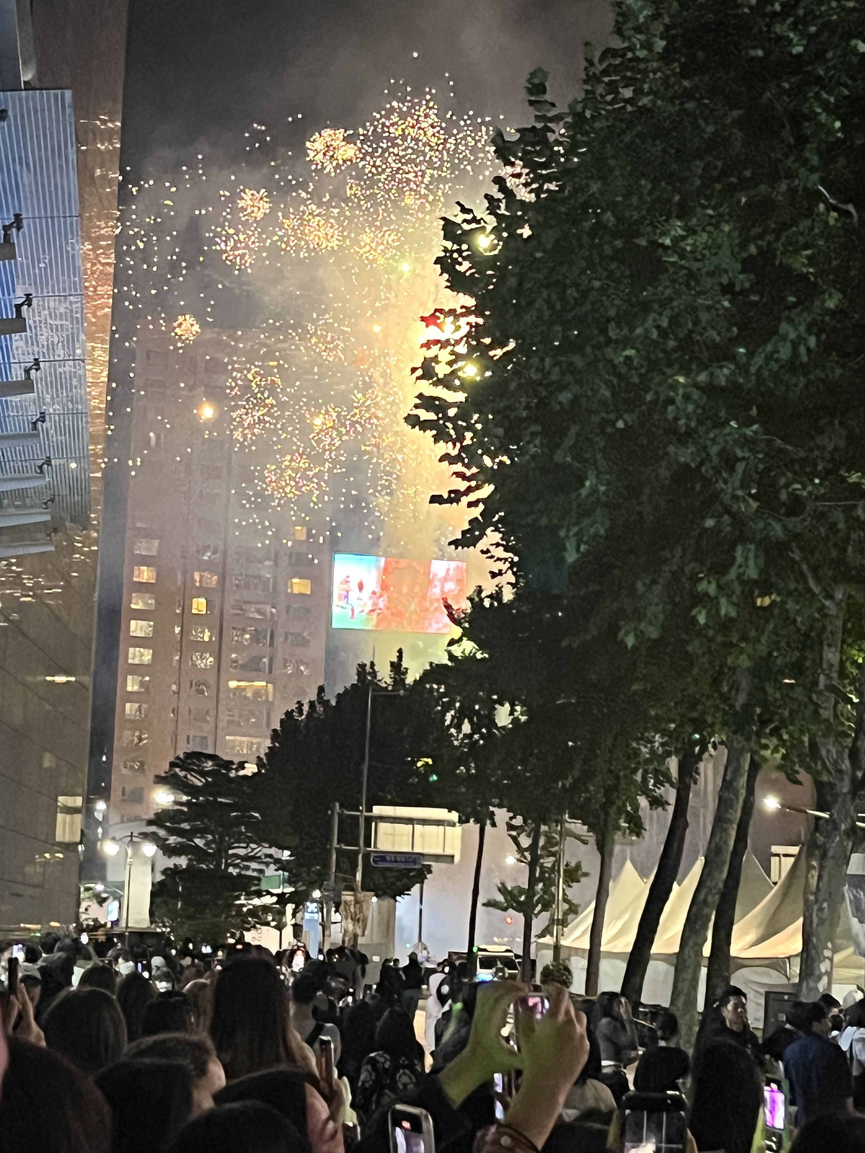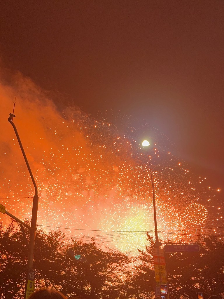 Con la poca voce che avevo in corpo, la mia voglia di cantare era più alta che mai e quindi ho detto “Linda! Trovami quel karaoke con le vetrate a Hongdae che voglio diventare un cantante e far vedere a tutti come sono bravo dalle finestre!” insomma non proprio così, ma il senso era quello – quindi, sì, tappa di nuovo a Hongdae al Karaoke che c’è stato anche nel drama “True Beauty”. Io tutto contento – un poco poco più costoso di quello di Itaewon (9.000₩ per 30 minuti) e purtroppo ci hanno dato la stanza lontana dal mondo dove nessuno ha potuto vedere la mia bravura canora! Ero distrutto… Comunque qui ci si leva le scarpe quindi lavatevi i piedi prima di venire. Oggi per le strade di Hongdae stavano allestendo mercatini e ancora non capisco per quale festa, forse per quella per la quale ci sono i fuochi d’artificio stasera? Boh. Abbiamo pranzato per le stradine di Hongdae con le patatine al mais in busta e visitato negozi di torte dove ho finalmente visto che mettono i pomodori come decorazione in quanto sono un frutto e sinceramente mi ha fatto abbastanza ridere, però i pasticceri coreani sono davvero bravi a fare le torte, proprio così. Oggi comunque non so cosa ci sia preso, ma abbiamo avuto un attacco di sonno improvviso che siamo andati in hotel alle 15:00 e ci siamo svegliati alle 18:30 urlando “I fuochi!!!” ebbene sì, avevamo deciso di andare a vedere i fuochi subito dopo pranzo in modo da prendere posto sul fiume Hangang e goderci indisturbati la bellissima serata ed invece no. Bloccati in metro per la quantità assurda di persone, percorsi deviati per far camminare i pedoni e strade chiuse per uno degli eventi più belli dell’anno, ma noi non ci siamo fermati a niente. Arrivati al fiume, abbiamo camminato un pochino credendo che potessimo guardare prima o poi i fuochi senza ritornare tipo in hotel visto che non c’era posto nemmeno a pagare oro, però una guardia, gentile come sempre figuriamoci, con il suo piccolo inglese ci ha fatto capire che questo non è un posto sicuro e che la visuale meglio sarebbe stata poco più avanti e probabilmente ci avrebbe anche accompagnato a quel posto, ma c’erano dei rincoglioniti che hanno urlato tutto il tempo e quindi ha dovuto disciplinarli in un quale modo o almeno credo perché era tutto un urlare. Alle 19:25 finalmente c’è stato il botto di inizio e BOOM, tutti a correre come se non ci fosse un domani mentre io e Linda, tanto non sapevamo dove andare, camminavamo proprio a passo leggiadro fino a che non abbiamo trovato un bel punto davanti a tutti bloccandogli la visuale. I fuochi comunque sono durati per un bel po’ e a scaglioni con pause di 30 minuti e vi posso dire che, ok erano bellissimi, ma all’inizio niente di che e tutti, ogni singola persona, era sorpresa, ma vi giuro, per ogni singolo stronzettinello di fuoco, dovevano per forza sorprendersi tanto è che abbiamo riso tutto il tempo. I fuochi comunque sarebbero durati fino a mezzanotte, ma ad un certa dopo essere stati in piedi nello stesso punto per un paio di ore, Linda ha deciso anche per me che sarebbe stata l’ora di andare via e quindi ci siamo incamminati all’uscita guardando una bellissima scena di finale di fuochi d’artificio – dove ha tremato letteralmente anche il pavimento – e mentre cadevano anche gli addetti perché non avevano visto le loro stesse sbarre. Scene epiche che credo rimarranno impresse nella mia piccola mente. Ritornare a casa è stato comunque un po’ faticoso perché ci hanno diviso in scaglioni in modo da prendere stazioni diverse e di non ingombrare tutte le metro. Questa quasi fine di vacanza non può che quasi concludere nel migliore dei modi.