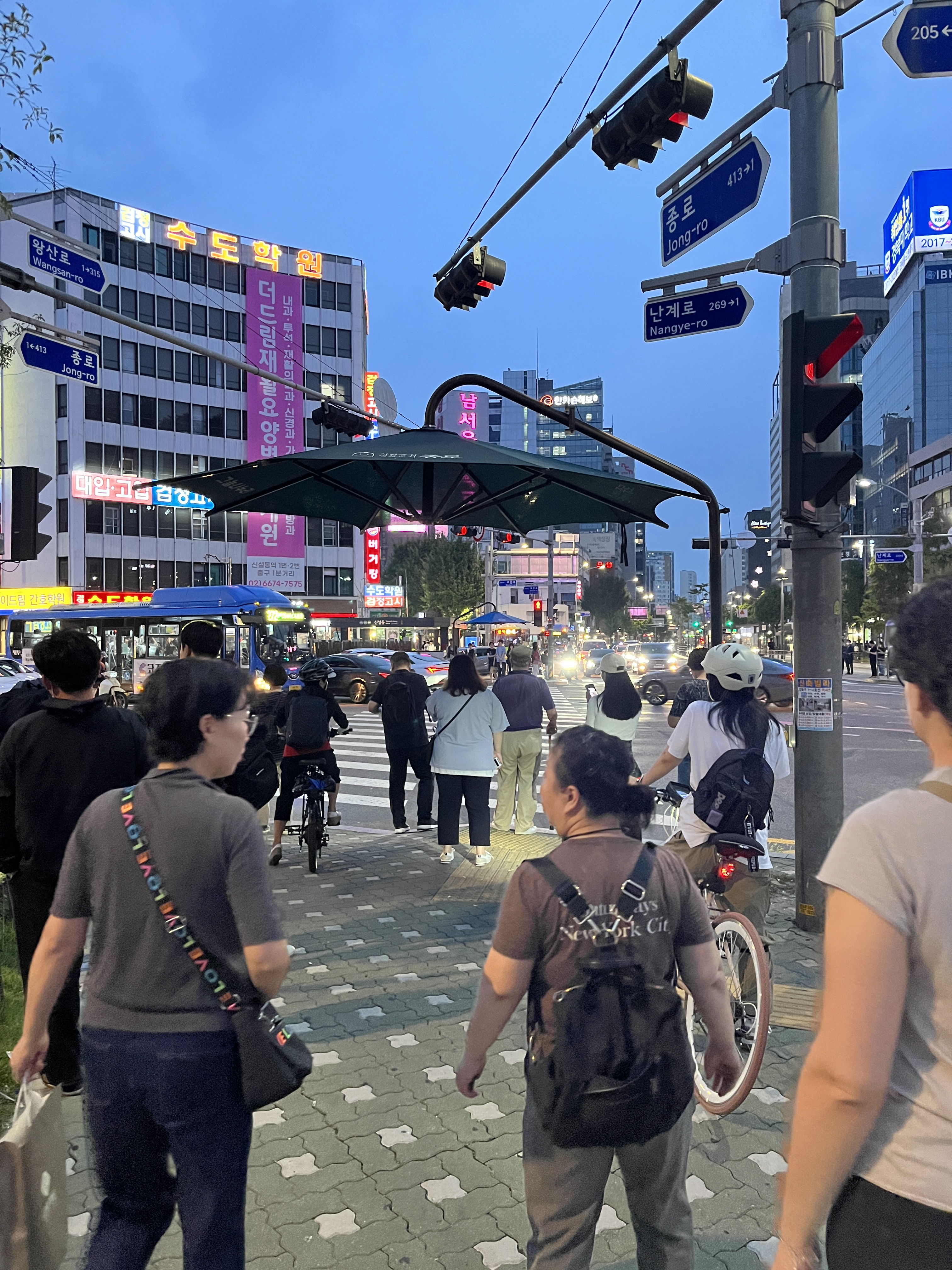 Tempo bruttino anche oggi, ma giornata di nuovo culturosa e quando dico così è perché siamo andati al museo. Protagonista di oggi è infatti il Museo Cheonggyecheon – un museo che parla della storia dei ponti, dei corsi d’acqua e delle strade di Seoul e sapete qual è il miglior modo per vedere questo museo, sempre gratis, come abbiamo fatto noi? Non al contrario. Ultimamente non so perché, ma un botto di musei e attrazioni l’abbiamo fatti dall’uscita fino all’entrata eppure non è che siamo tonti, è solo che prima ti mettono l’uscita quindi se io sto entrando, è normale che la scambio per l’entrata, quindi mi raccomando, entrate dall’altro lato per vedere questo museo che noi siamo entrati che c’erano già i ponti e le strade per poi ritrovarci il nulla. La giornata poi è proprio continuata leggera, leggera: ho aspettato il bus per la prima volta all’interno delle cabine climatizzate dove puoi ricaricare anche il telefono e premetto che si stava meglio fuori che dentro. Poi siamo ritornati, ancora sì, a Myeongdong per andare allo Shinsegae – un altro centro commerciale quasi parallelo al Lotte Young Plaza – dove abbiamo mangiato (dove Linda ha mangiato, scusate, io ero sempre pieno dovuto alle mie abbuffate colazionistiche) e vi posso dire che anche qui ci sono delle soluzioni vegetariane come qui al 김선생 바른 김밥 쇼호 (cliccate per vedere il ben di Dio che c’è) o sennò, proprio di fronte, c’è questo 화정 By 카쿠시타 dove Linda ha preso dei bellissimi, e per quello che ho assaggiato, anche buonissimi, Udon al pesto e crema. Effettivamente questo centro commerciale ha un’eterna vastità di cibo che forse batte anche gli altri riguardo all’indecisione di dove vorreste mangiare. Dopo ovviamente siamo ritornati allo street food e fa un certo effetto averlo visto di giorno e non notturno come abbiamo sempre fatto e comunque, giorno o notte, c’è sempre un botto di gente. Io comunque, non so perché, ma ho pranzato allo Starbucks proprio di fronte al Lotte Young Plaza con una tazza al cioccolato e panna freddo. La sera, inutile dirlo, abbiamo rigirato il mercato e cenato un’altra volta da McDonald. Purtroppo le giornate stavano finendo un po’ così e così, fiacchi per la stanchezza e perché tra un po’ saremmo tornati a casa e nonostante stiamo rivisitando quasi sempre le stesse cose, in un modo o nell’altro, tutta la città cambia sempre, con tantissime altre attività da fare.